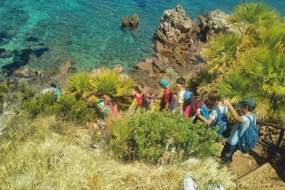 - Partenza per la passeggiata nel sentiero costiero della Riserva per conoscerne la storia, dalla marcia del 1980 ad oggi, la biodiversità del territorio e imparare a riconoscere le specie della macchia mediterranea attraverso attività di educazione ambientale calibrate all'età dei partecipanti nel rispetto del Metodo Educativo Palma Nana©